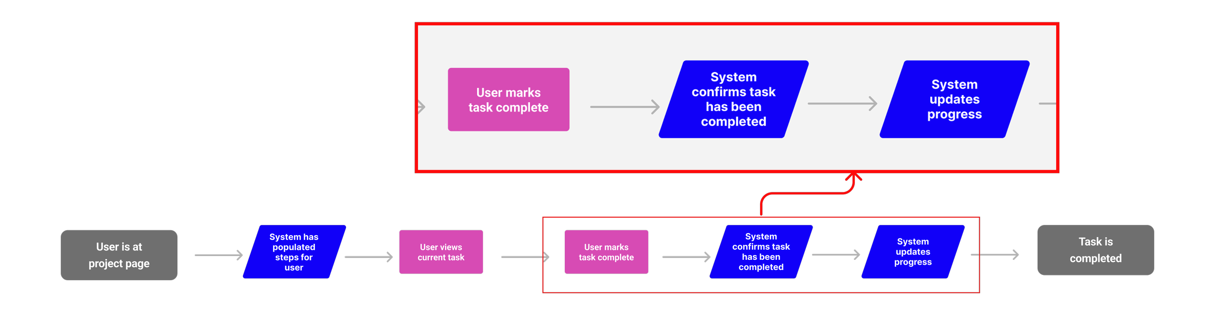 Finally, I outlined the experience of DIYers checking off project tasks, showing how quick confirmations keep them organized and confident in continuing or resuming their projects