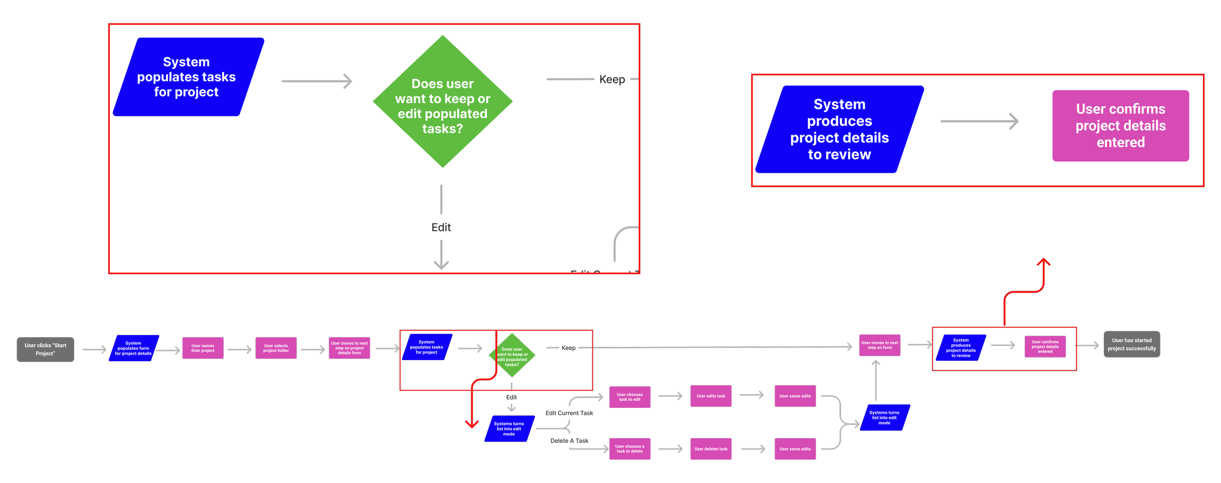 With no existing flows to build from, I used our “How Might We” ideas to shape that prospective user flows that prioritized organization, clear progress tracking, and timely project completion